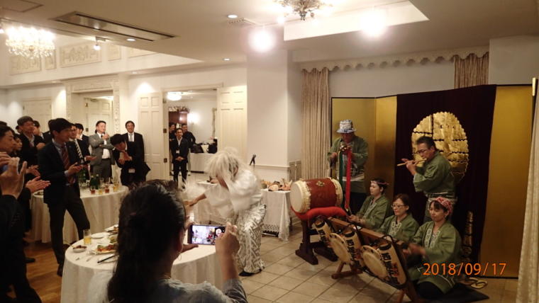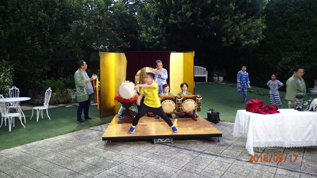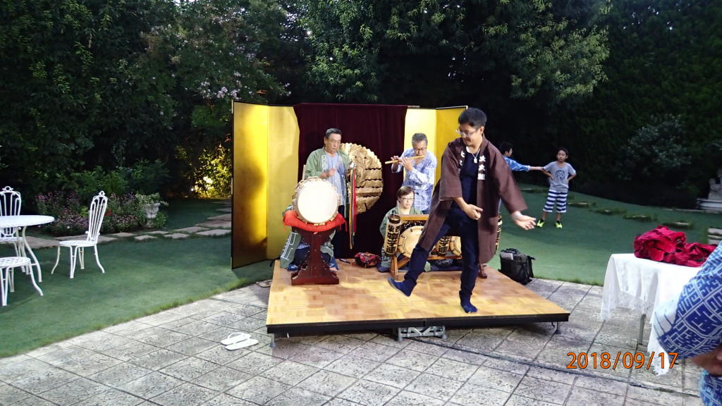 庭園内での音合わせも急な雨で室内でのお囃子になりました。